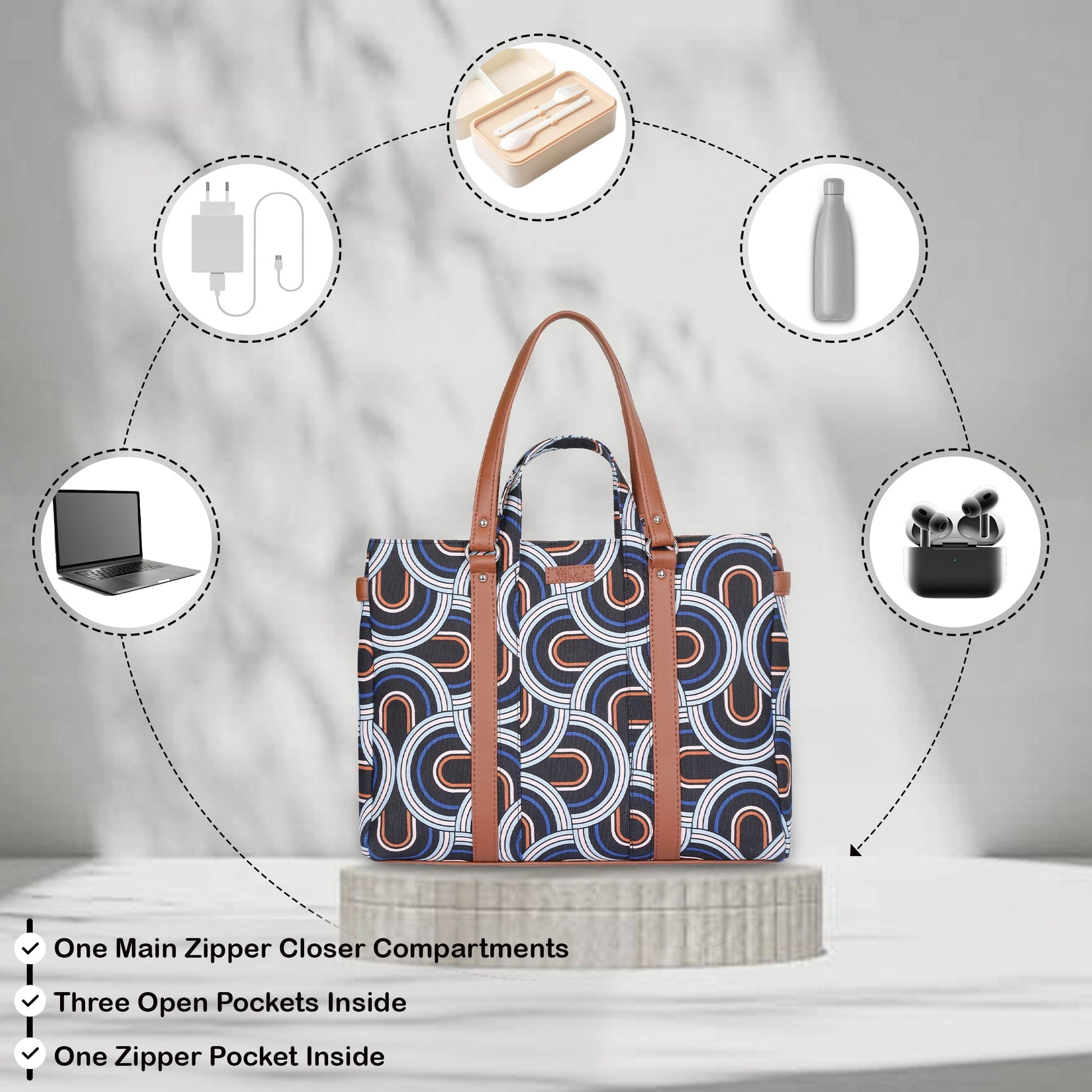Smart, Stylish & Sustainable: A chic tote bag designed for work, meetings, shopping, and everyday elegance. Crafted from durable printed hand crafted fabric with vegan leather detailing and a soft polyester lining for a refined yet eco-conscious appeal.