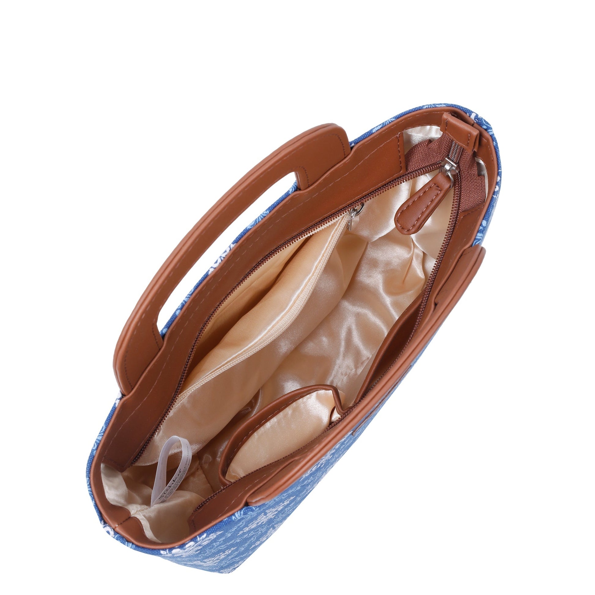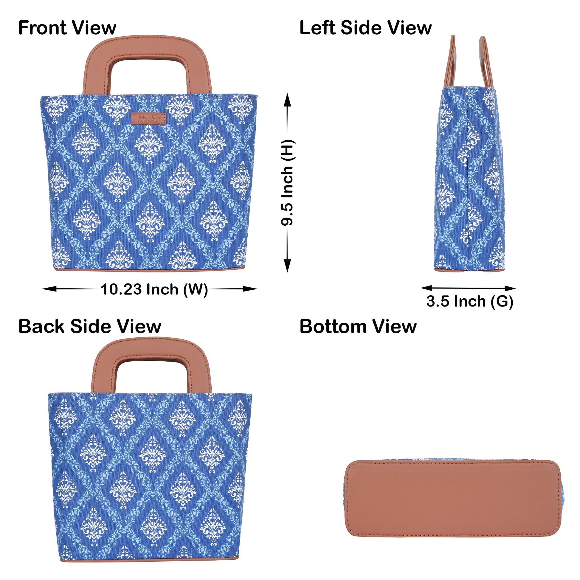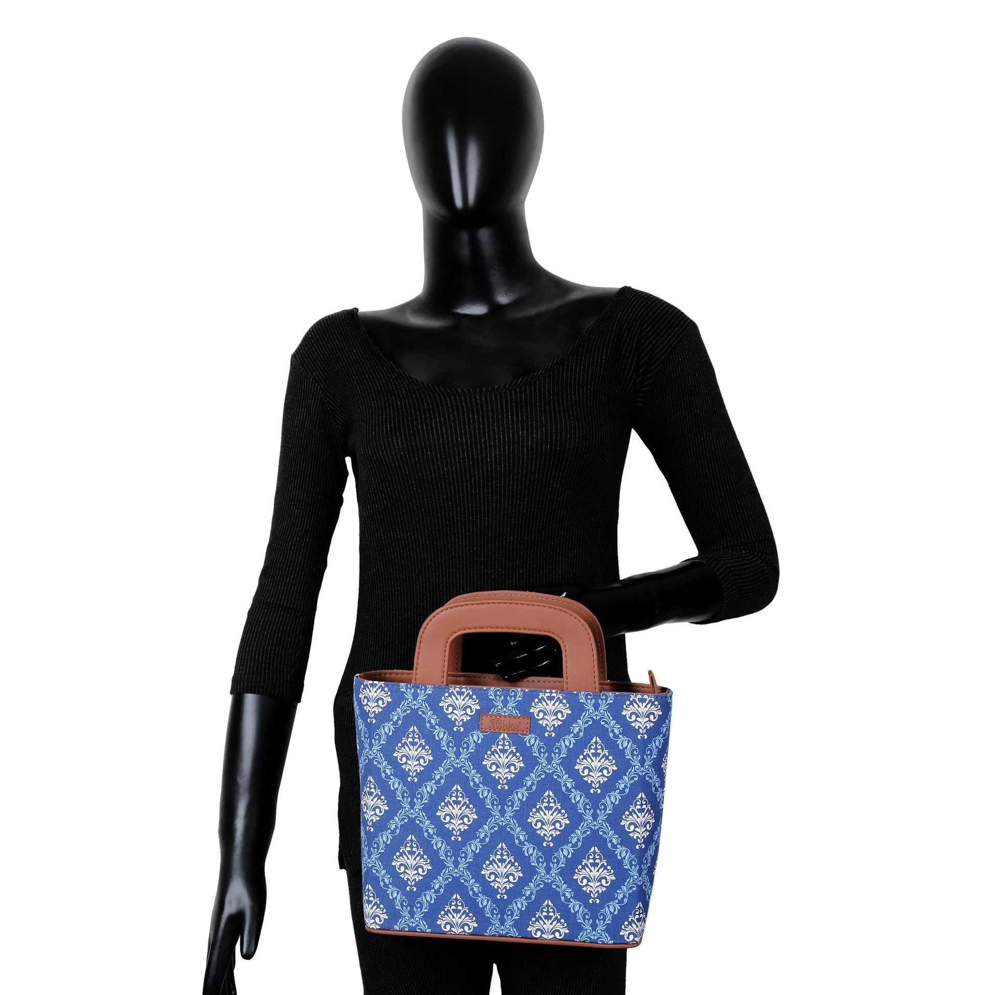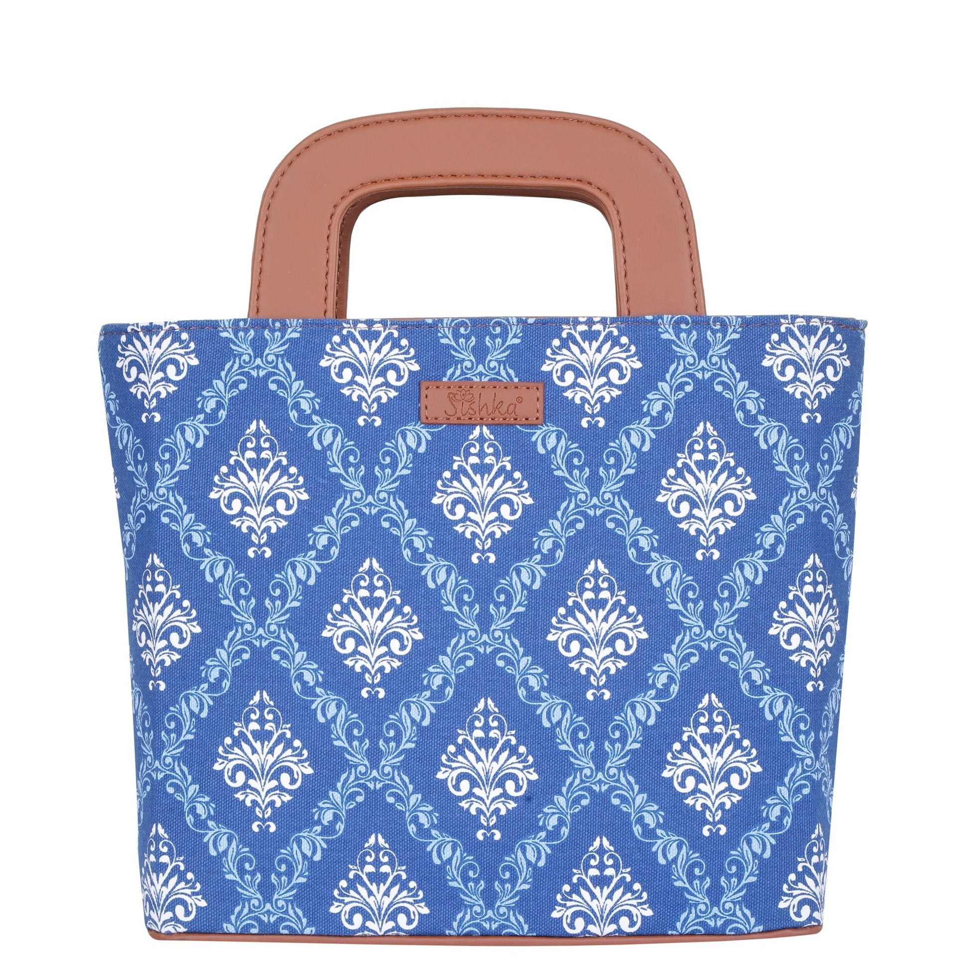Blue Handcrafted Printed Handbag – Women’s Top Handle Tote Satchel with Leather Trim