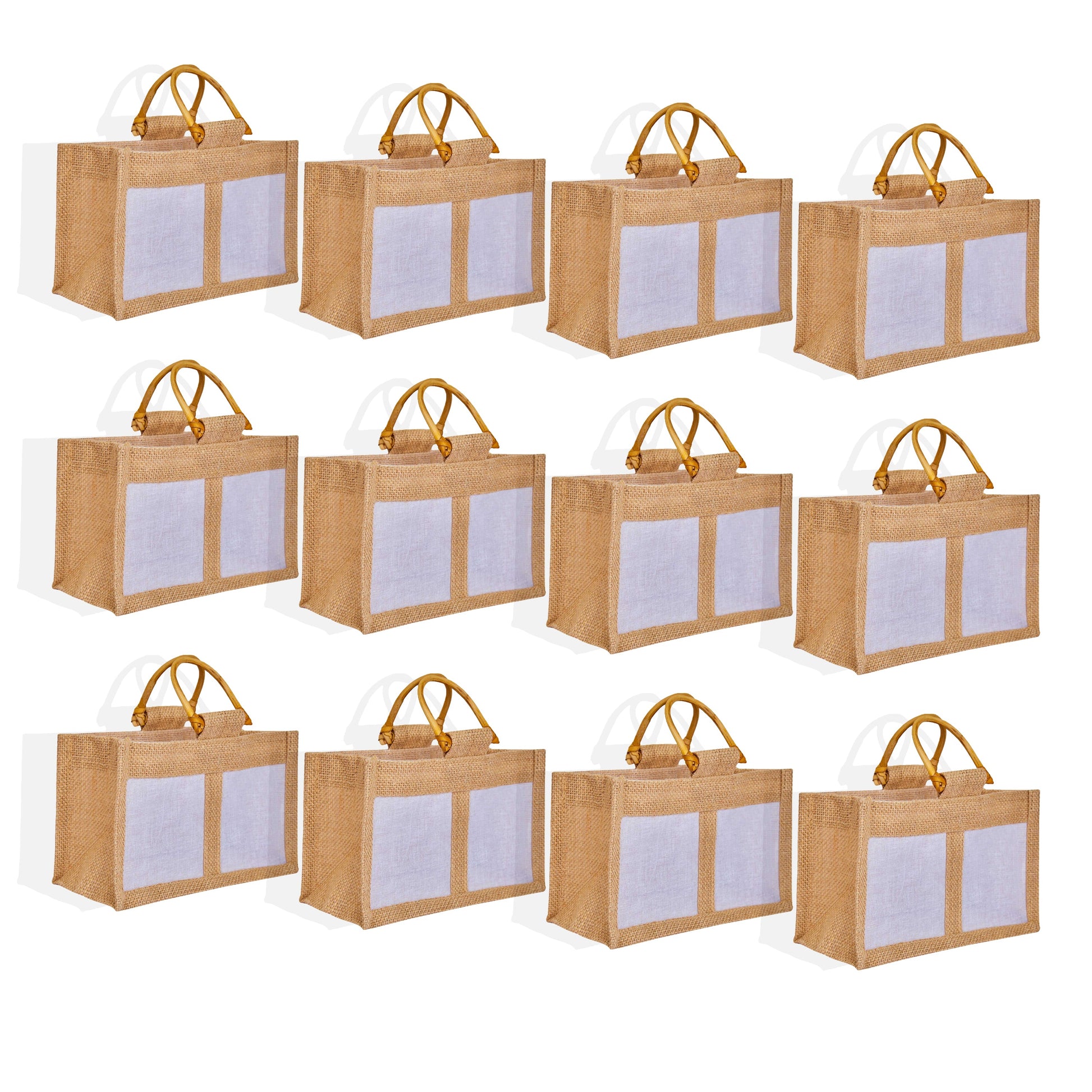 Jute Gift Bags with Cane Handles & Organza Panels – Burlap Pouches for Weddings, Bridesmaid Gifts, Parties (12 Pcs)