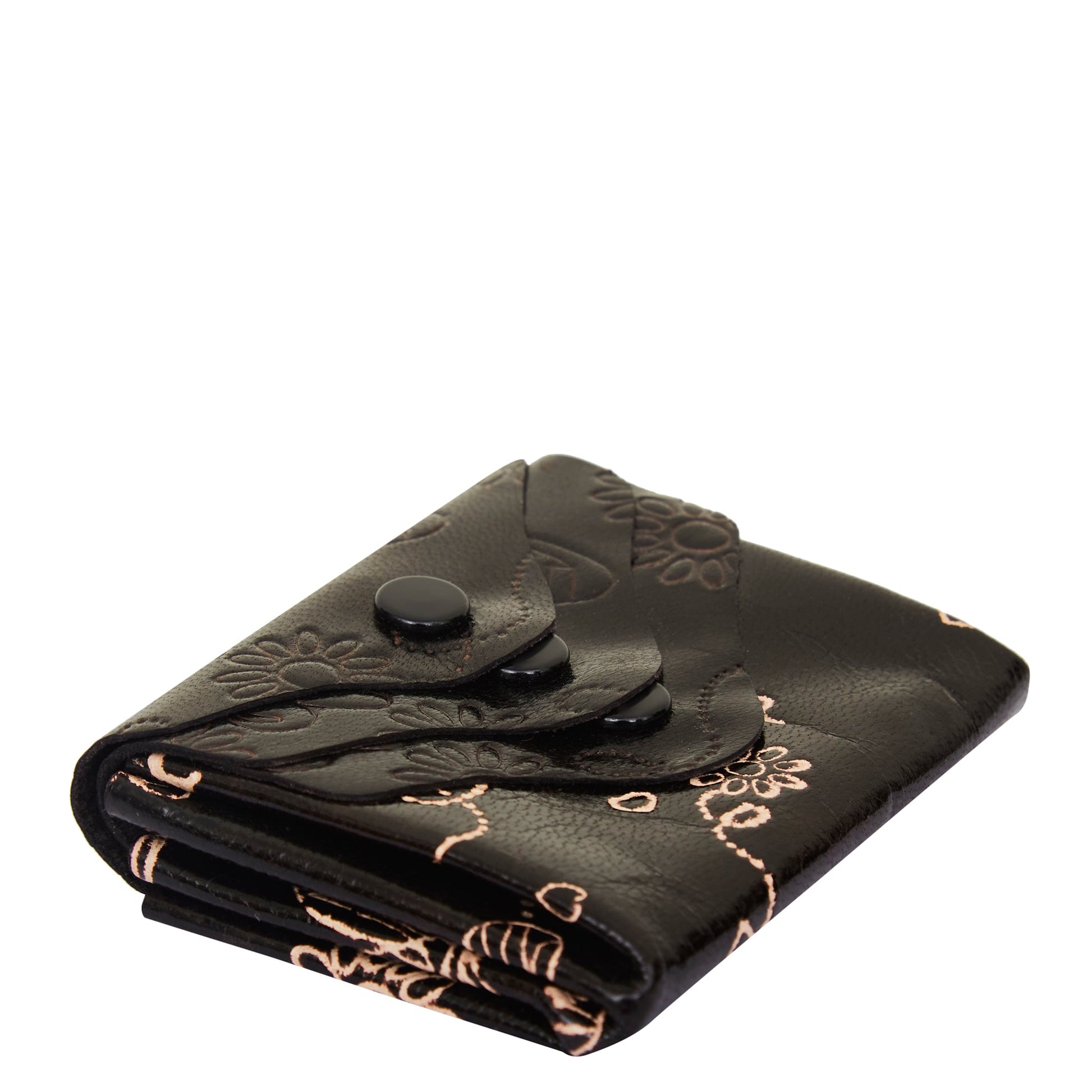 Hand-Painted Black Leather Purse with Three Button Charm