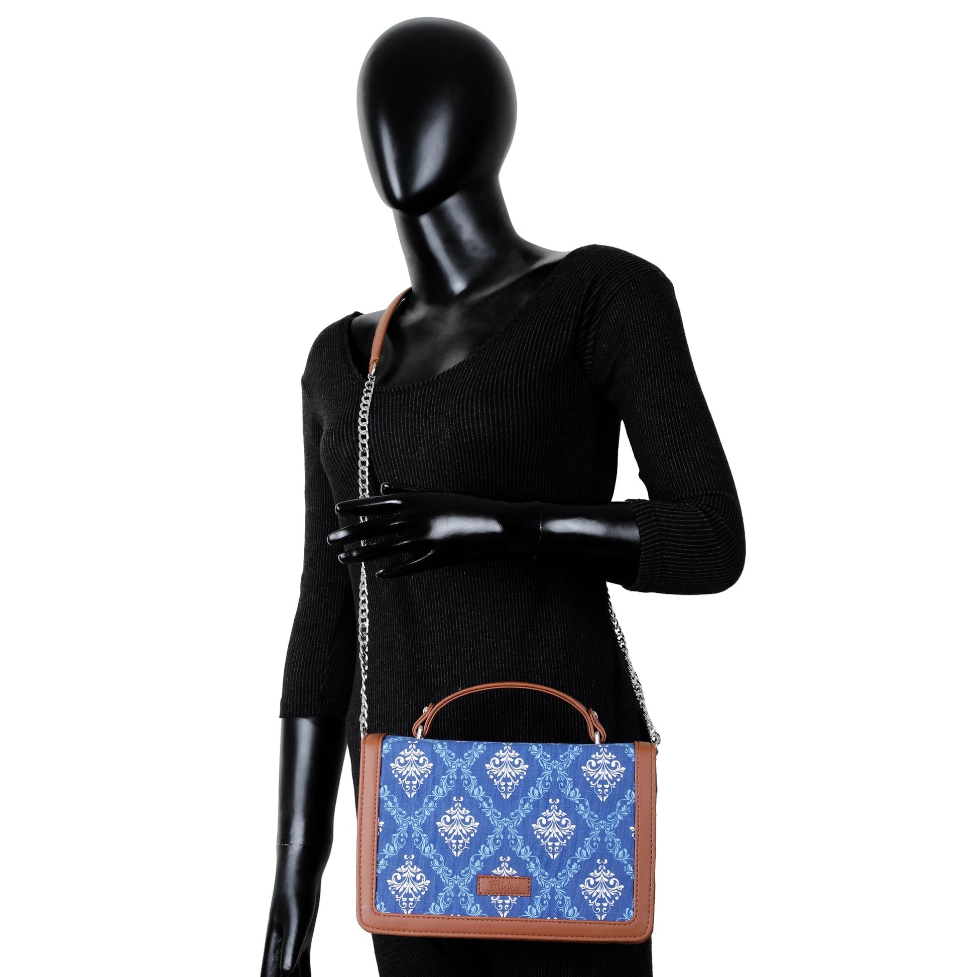 Handcrafted Blue Damask Print Crossbody Sling Bag – Women’s Fabric Purse with Chain Strap