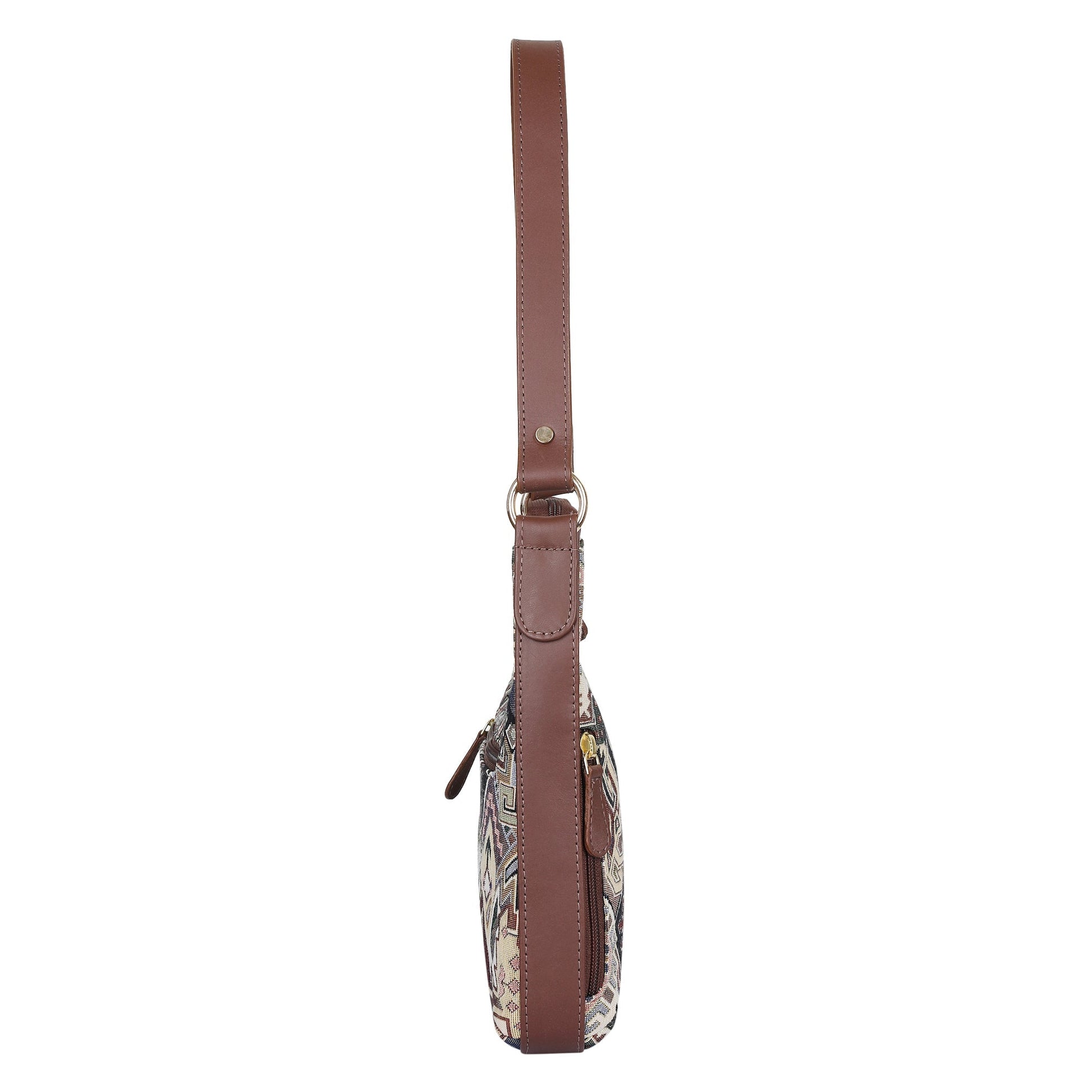 Geometric Pattern Tapestry Hobo Bag For Ladies| Stylish Leather-Trimmed Shoulder & Satchel Bag with Leather Strap for Office & Outings