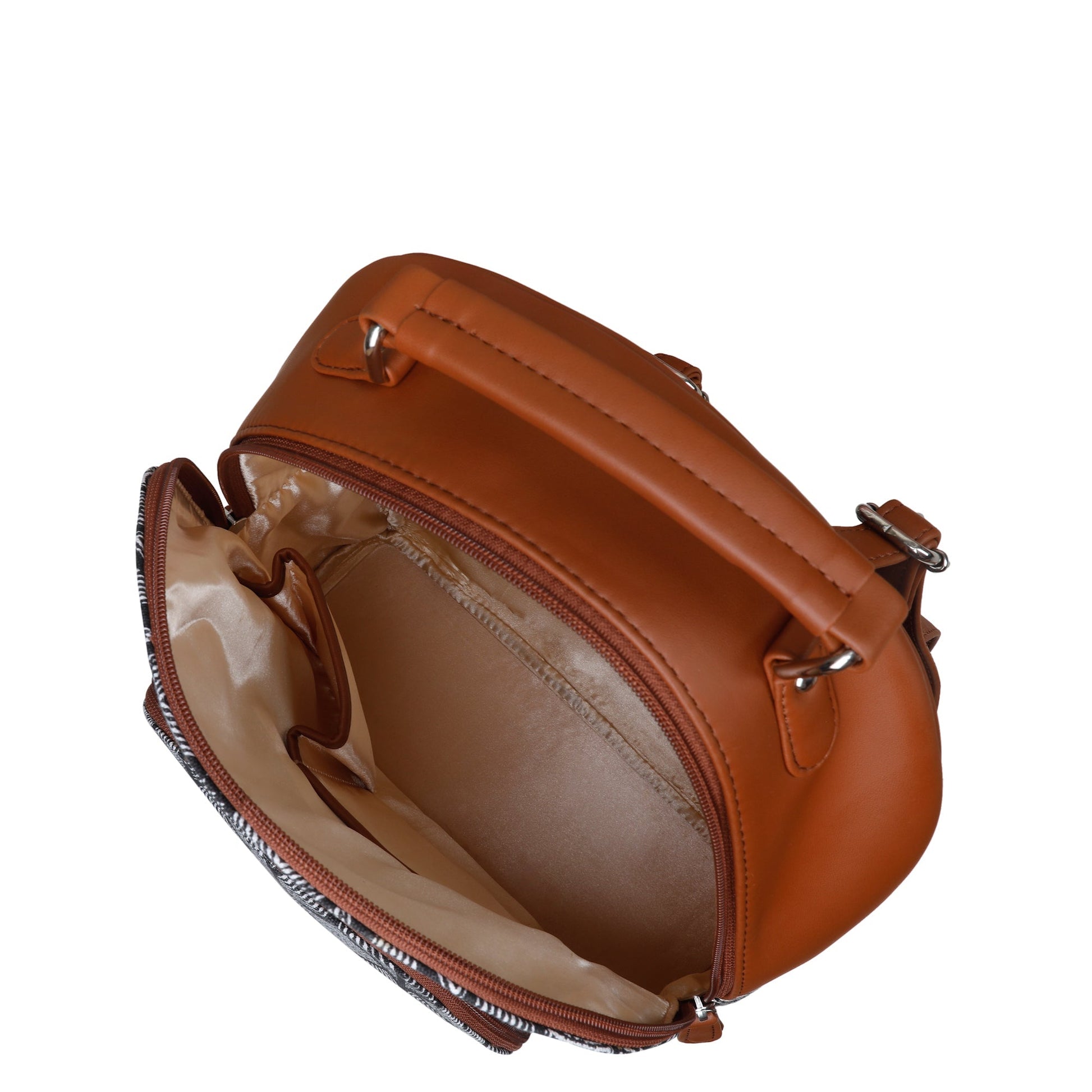Premium Quality & Design: Our Backpack is crafted from durable Hand Crafted Printed Fabric with vegan leather trim and pullers, featuring a sleek silhouette and a top vegan leather handle for convenient grab-and-go functionality.