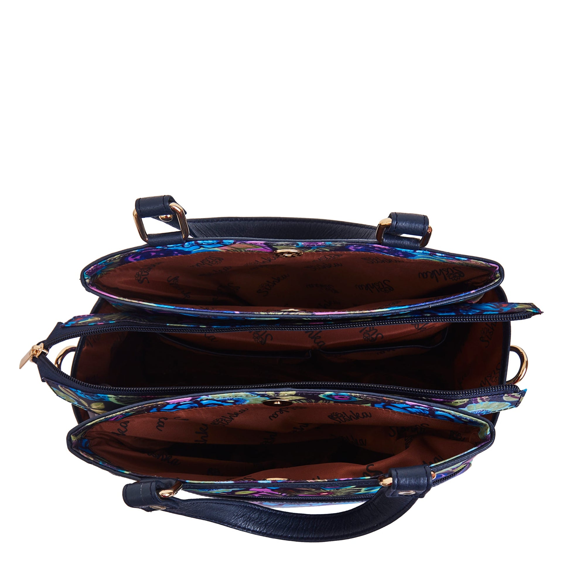 Multi-Compartment Botanical Print Satchel Bag with Leather Trim