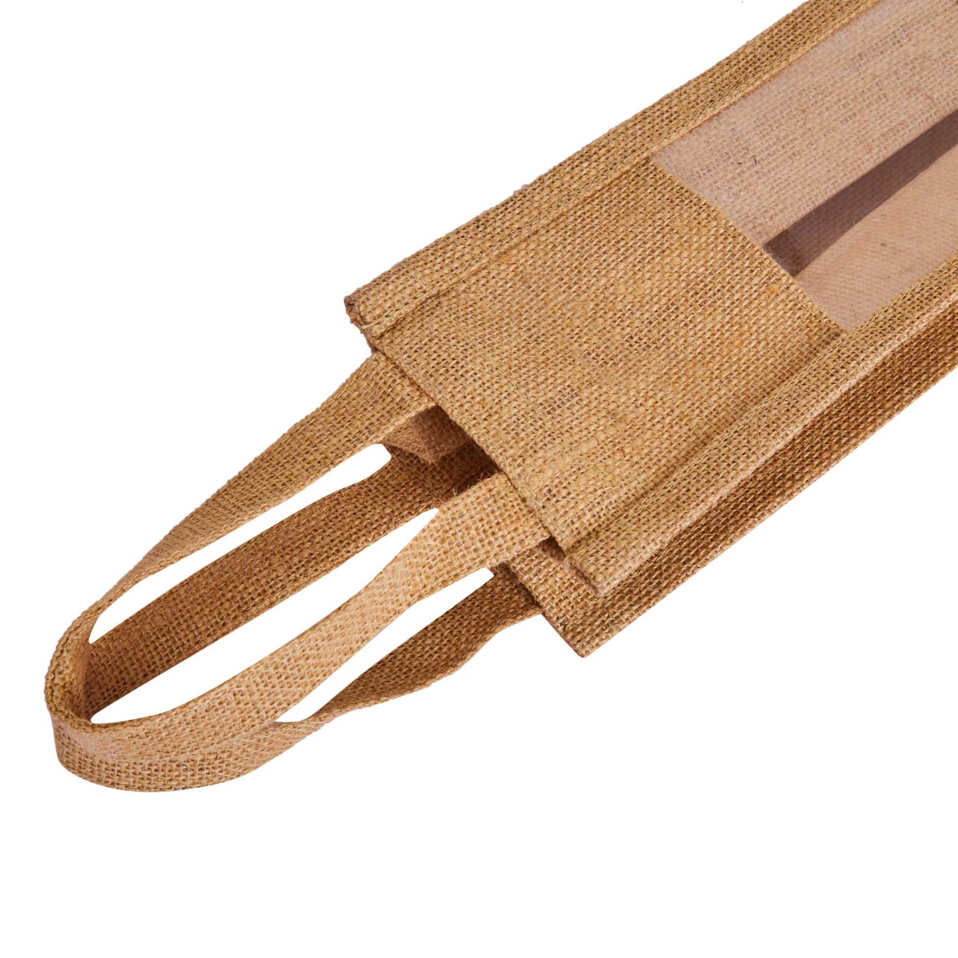 - Elegant & Functional Jute Wine Bags - These laminated jute wine bags combine sophistication and simplicity, perfect for carrying wine bottles and serving as stylish party favors at any event.