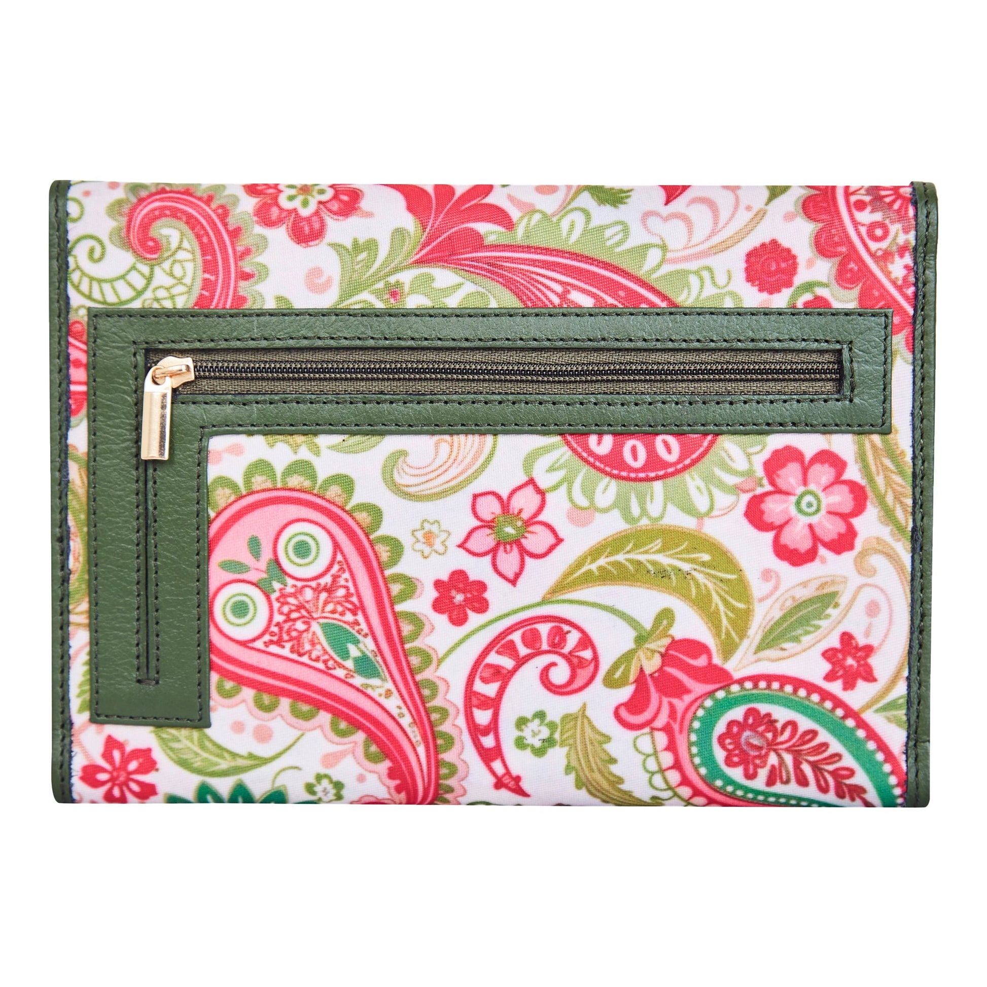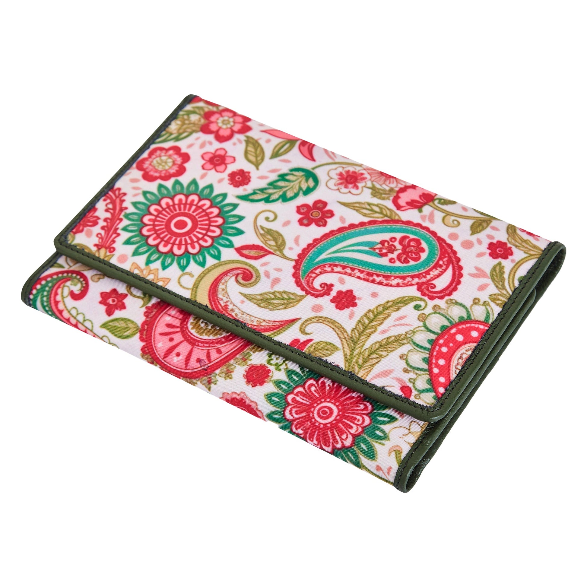 Paisley Pattern Trifold Wallet and Organizer with Leather Accents for Women