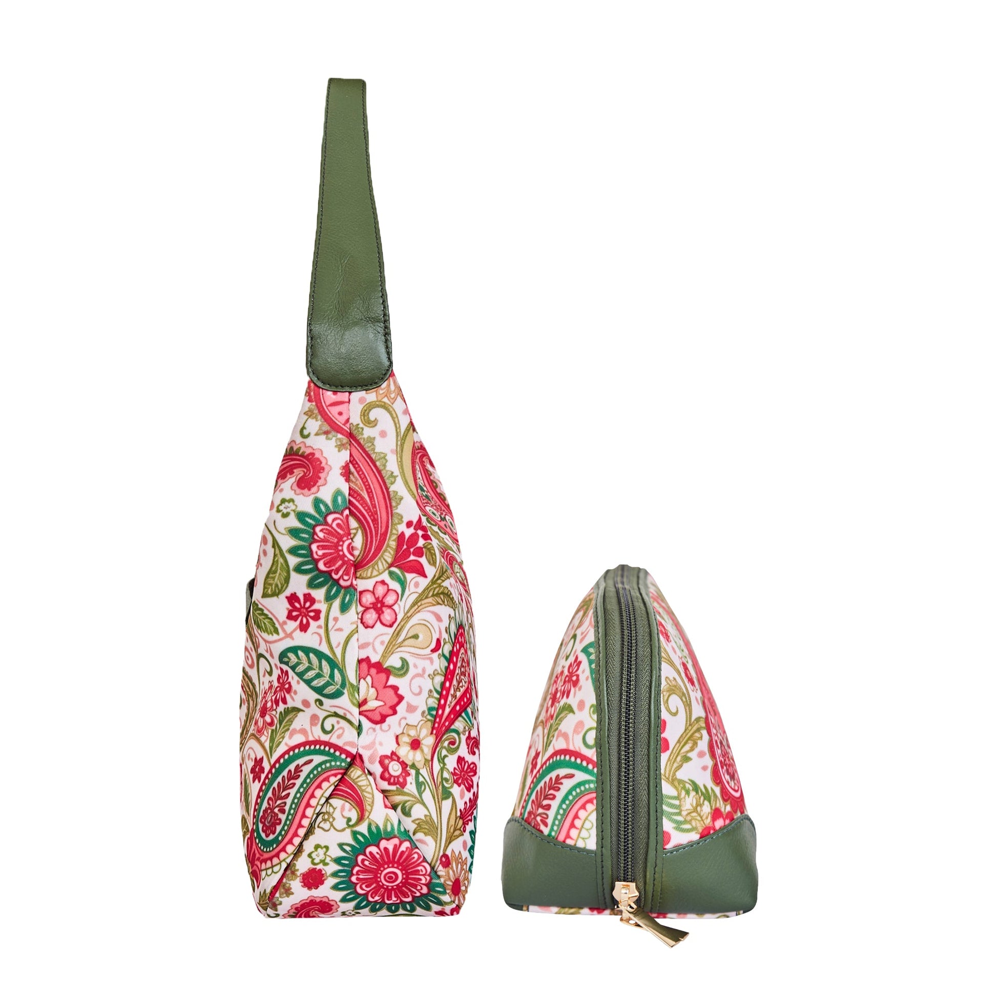 Timeless Sophistication: Embody elegance every day with the Paisley Print Sling Hobo Bag and matching paisley-patterned cosmetic bag.