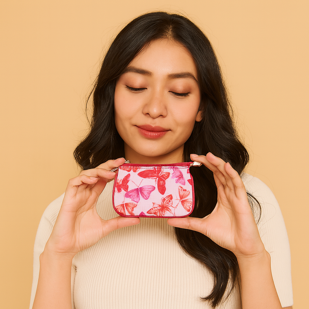 Capture attention with this butterfly-themed travel coin pouch, complete with a key fob inside, making it the perfect accessory to keep your essentials secure and showcase your personal style.