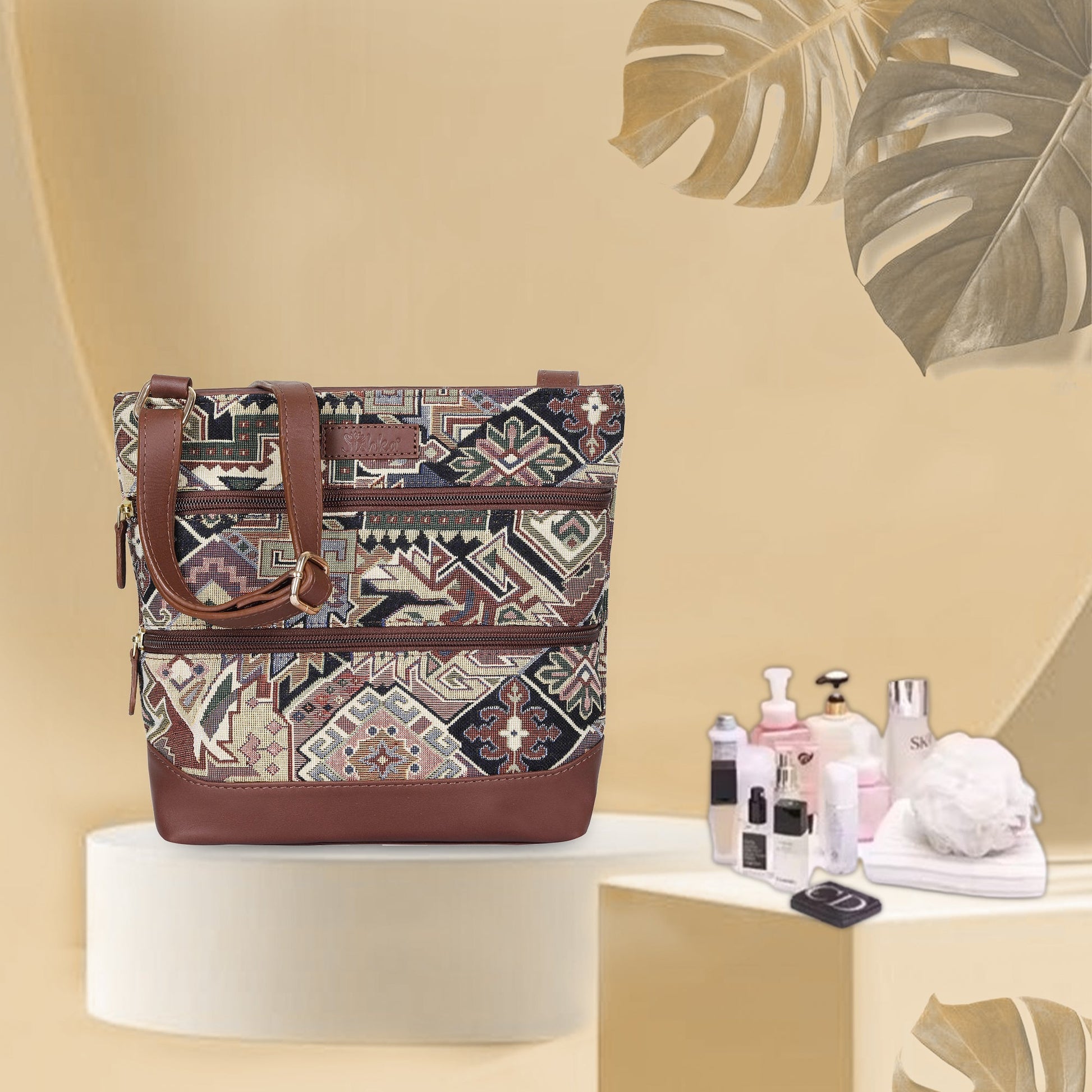 Crafted from premium tapestry fabric with leather accents, this stylish bag is available in Vintage, Geometric, Botanical, Floral, and Abstract patterns to match your personal style.