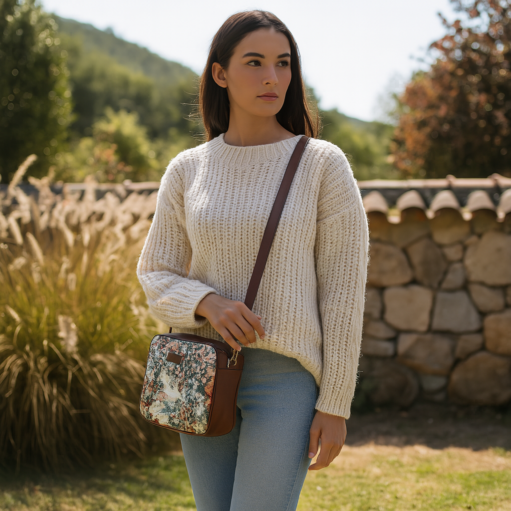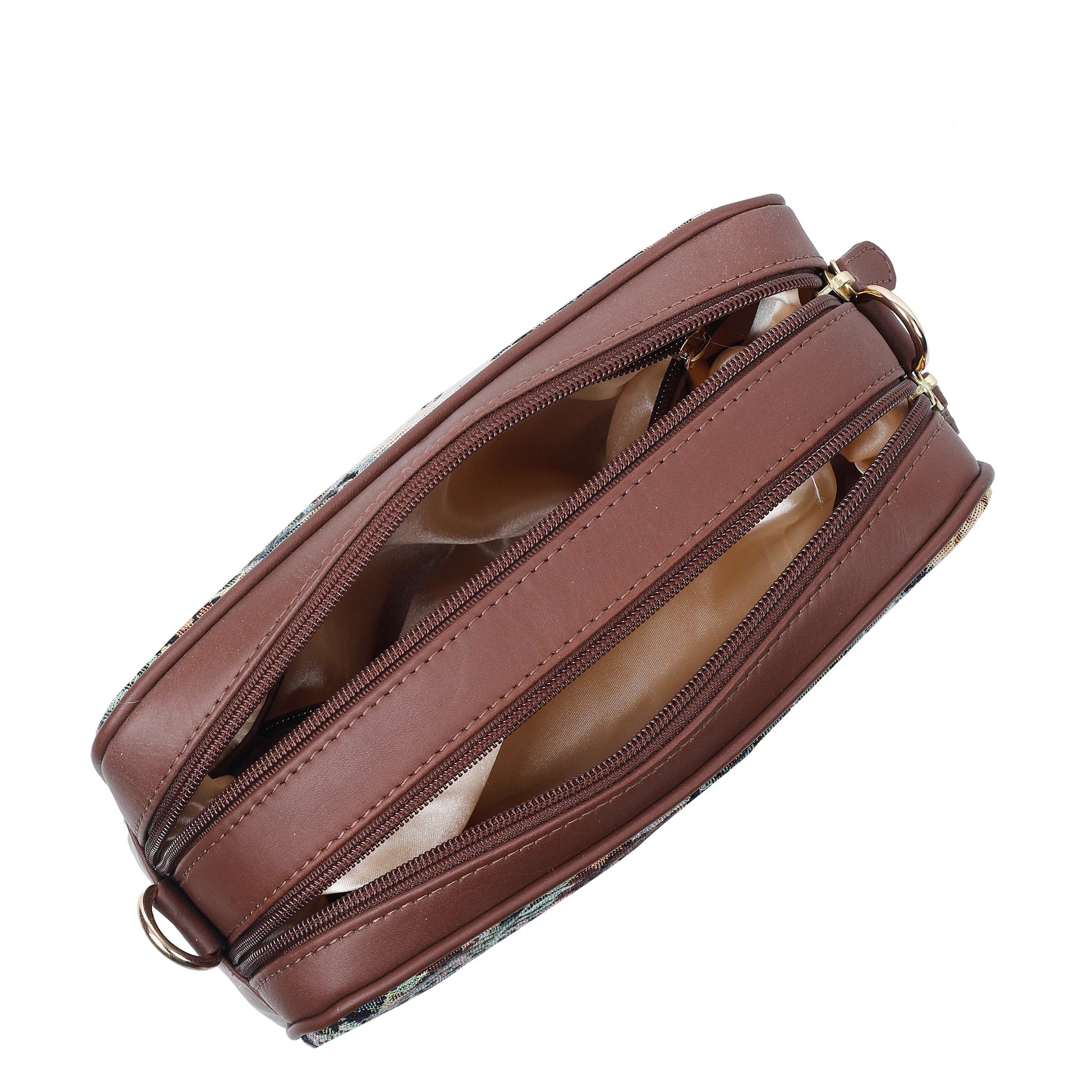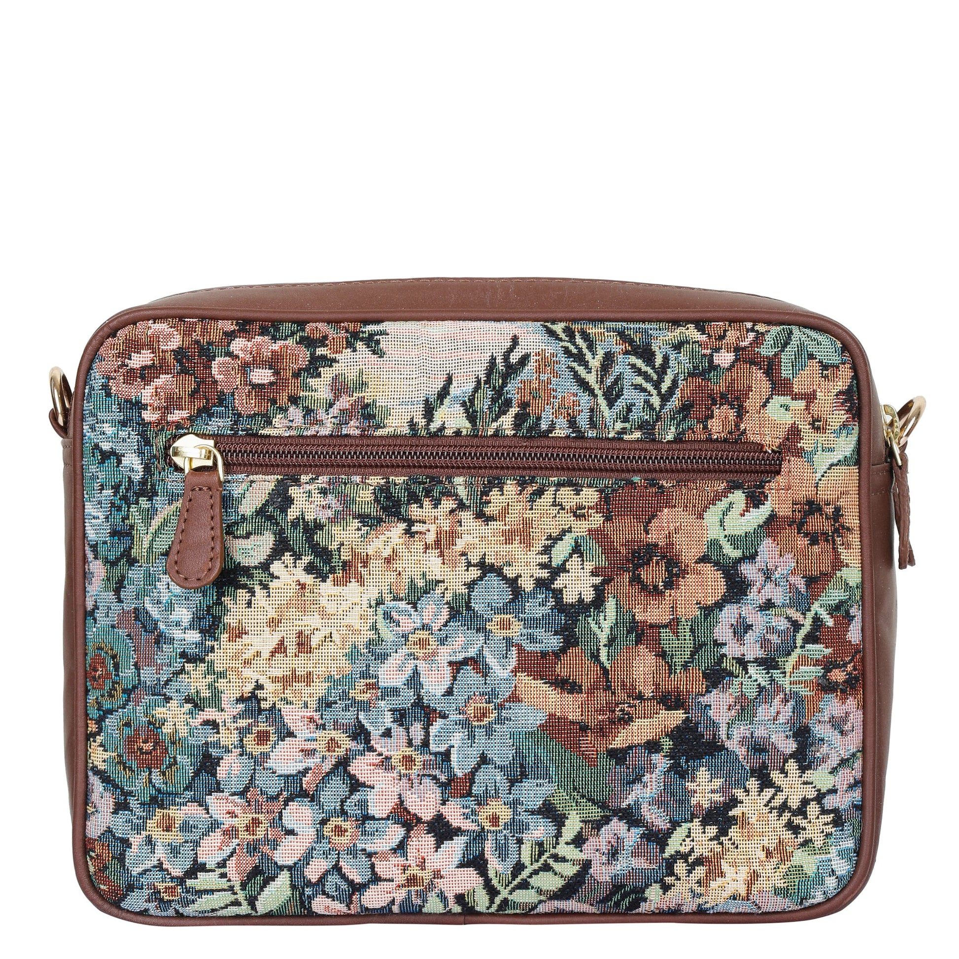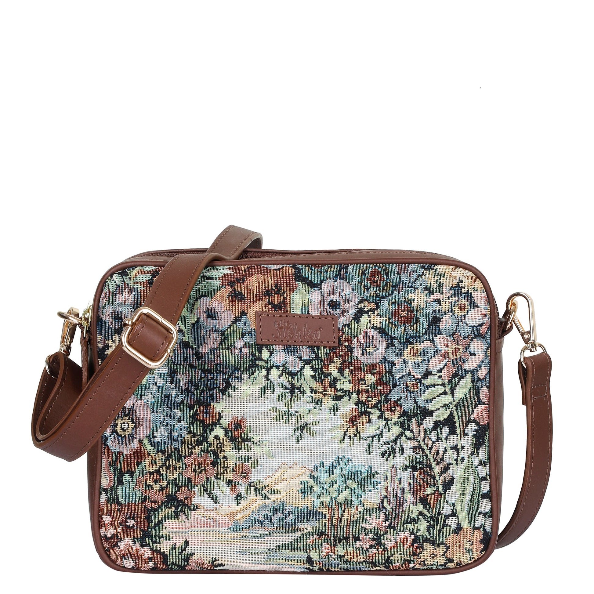 Women’s Botanical Tapestry Crossbody Sling Bag – Vintage Inspired Shoulder Purse with Genuine Leather Trim